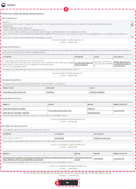 - 약관 전체 동의 후 [확인] 버튼 선택