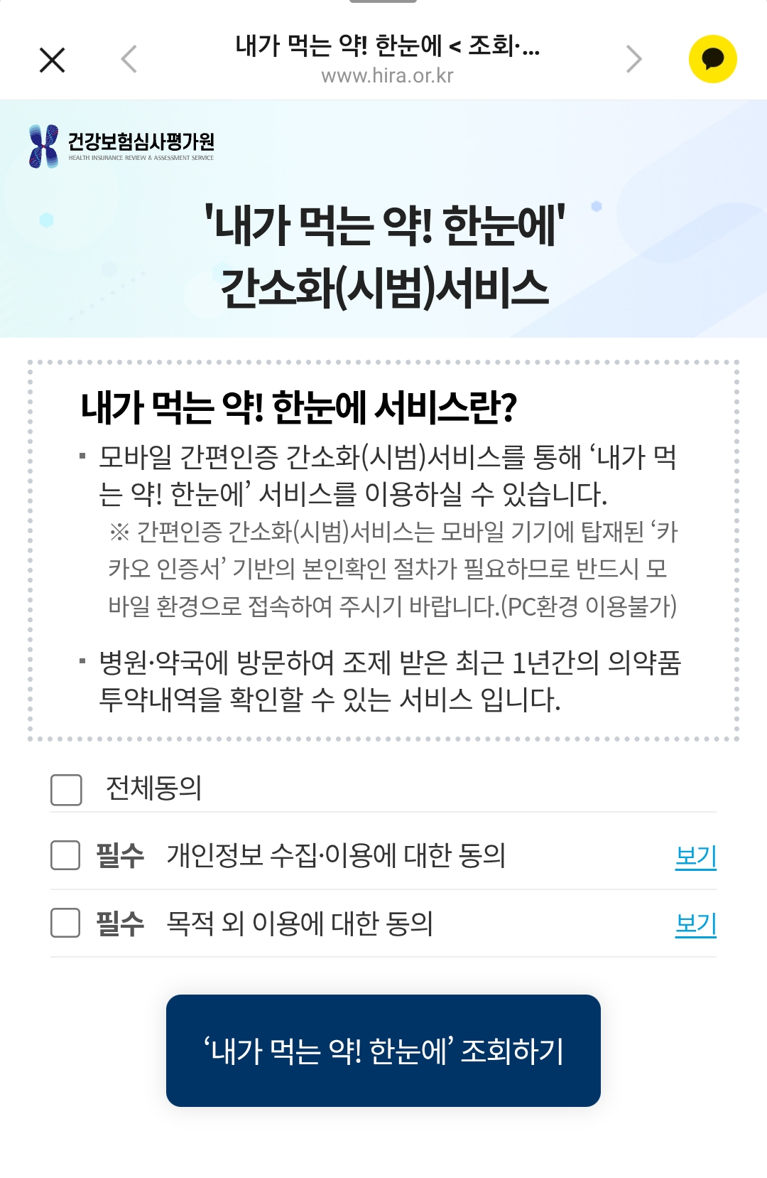 카카오톡 간편 인증만으로 최근 1년간의 의약품 투약 이력을 확인할 수 있습니다.
