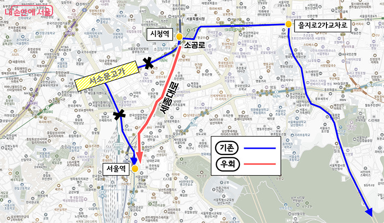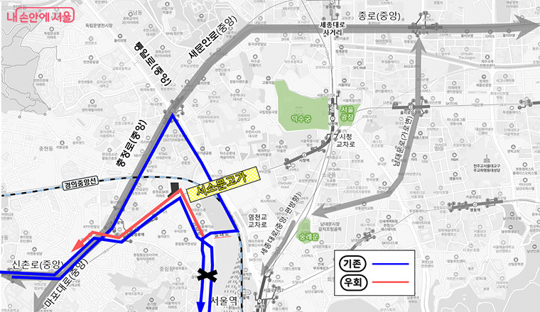 세종대로→통일로→충정로 충정로→새문안로→세종대로 통일로→충정로 |
