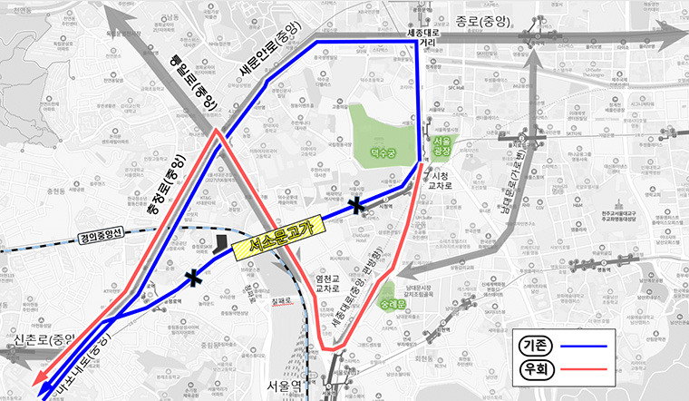 | 고가 왕복 통과 노선 | 172, 472, N62, N73, N51 | 충정로→통일로→세종대로 |