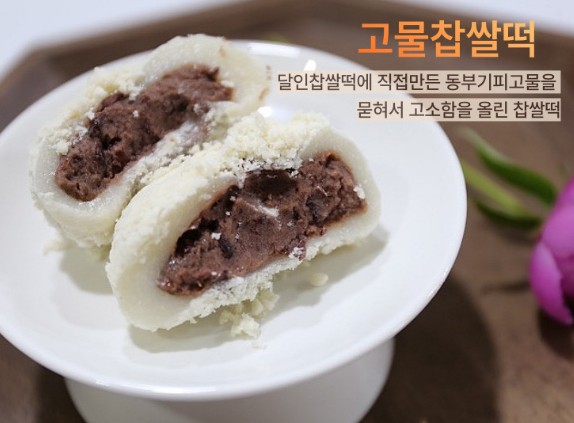 - 달인찹쌀떡에 직접 만든 동부기피고물을 묻힌 찹쌀떡