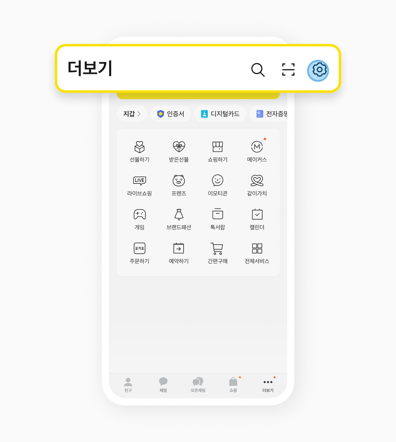1. 카카오톡 실행 후 [더보기(…)] → 우측 상단 [설정(⚙️)] 아이콘을 눌러주세요.