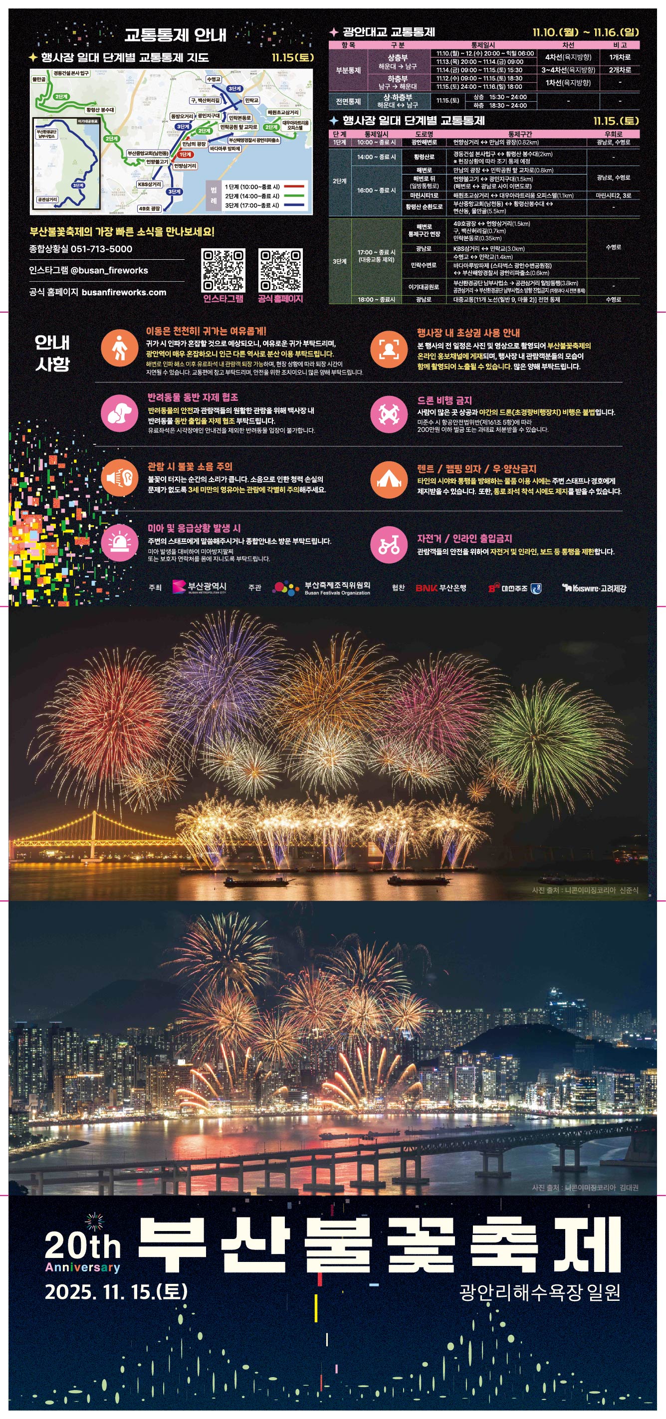 2025년 11월 15일(토), 광안리해수욕장 일원에서 열리는 제20회 부산불꽃축제를 앞두고, 행사 정보를 한눈에 확인할 수 있는 공식 리플렛을 다운로드 하실 수 있습니다. 행사 당일의 교통 통제, 프